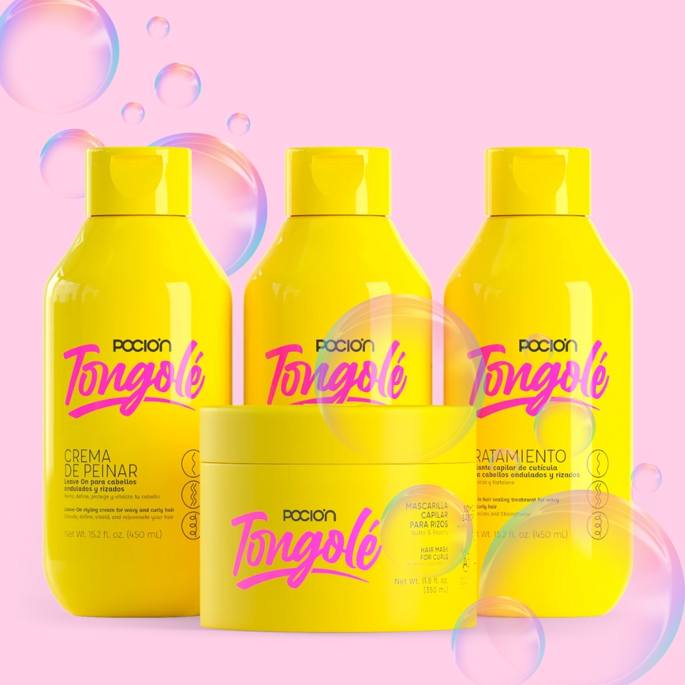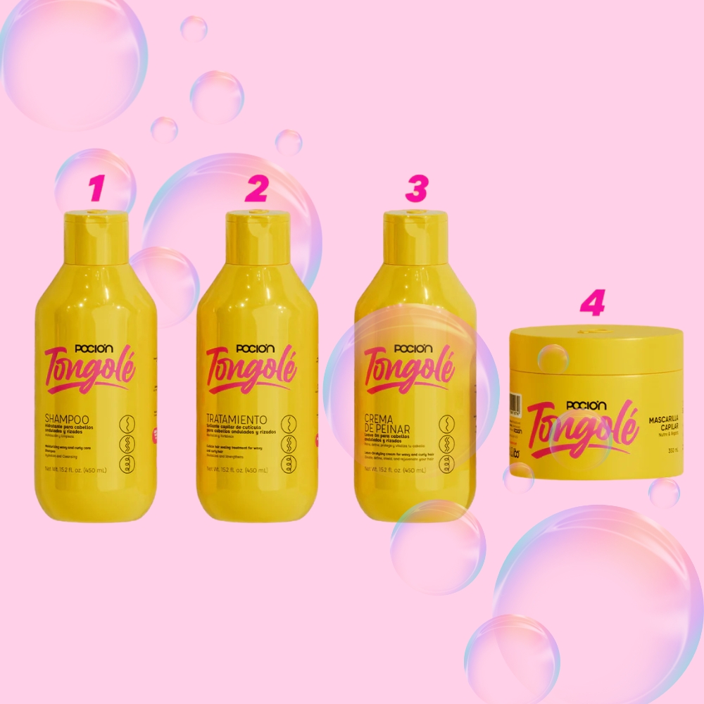 Kit para el cuidado capilar Tongolé, marca La Poción, incluye shampoo 450 ml, acondicionador450 ml, tratamiento 450ml y mascarilla capilar 350ml.